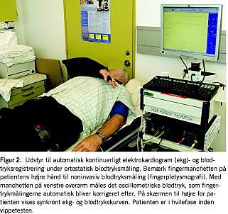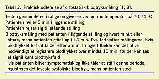 Den egentlige ortostatiske blodtryksmåling udføres mere systematisk primært ved aktiv standforsøg i henhold til nedenstående protokol (Tabel 3). Testen er meget simpel, nemt anvendelig og forholdsvis let tilgængelig. Ulempen er, at den tilgrundliggende fysiologi er forholdsvis kompleks, og resulta-terne skal tolkes med forsigtighed og kan være svære at reproducere. Ydermere skal den autonome dysfunktion være fremskreden, før testen giver positive resultater [8]. Hvis det aktive standforsøg (Figur 1) er negativt, anbefales der en passiv vippetest, som udføres på samme måde, som vist i Tabel 1, og som også kan være en fordel hos patienter med svækket standfunktion. Ved mistanke om ortostatiske synkoper anbefales der ikke supplerende administration af sublingual nitroglycerin, der nedsætter sensitiviteten af vippetesten og medfører falsk positive resultater [1]. Det anbefales, at anvende noninvasiv, automatisk og kontinuerlig registrering af blodtryk og hjertefrekvens under testen (Figur 1 og Figur 2), hvilket giver et bedre billede af kredsløbsresponset og gør fortolkningen af testen lettere. Hvis et sådant udstyr ikke står til rådighed, kan den ortostatiske blodtryksmåling alternativt udføres, ved at man måler puls og blodtryk hvert minut.