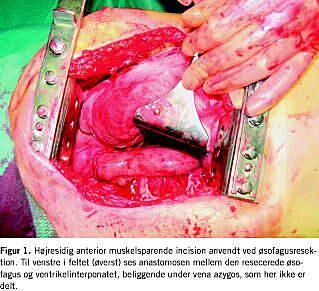 Der anvendtes rutinemæssig kombineret abdominal/torakal adgang med tostadielymfadenektomi. Laparotomien blev udført via bueformet transversel epigastriel incision med tildannelse af ventrikelrør, pyloromyotomi og lymfadenektomi på station 1,2,3,4sa,7,8,9,11. I tre tilfælde strakte cardiacanceren sig så langt ned på ventriklens lille curvatur, at der blev foretaget total gatrektomi med D2-lymfadektomi og konstruktion af Roux-en-Y-rør til anastomose. Torakotomien blev udført via en højresidig anterior muskelsparende incision ± deling af venstre vena azygos (afhængig af tumorniveau) (Figur 1 ), idet man tilstræbte mindst seks centimeters afstand til den orale resektionsrand samt standardmediastinal lymfadenektomi. Der blev foretaget cirkulær staplet anastomose samt anlagt et abdominaldræn og to pleuradræn. Endvidere blev der anlagt ventrikelsonde med spidsen 10-15 cm analt for den øverste anastomose, og naso-jejunal ernæringssonde med spidsen beliggende 15-20 cm analt for Treitz' ligament (eller anale anastomose ved total gastrektomi).