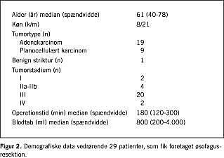 Operativ behandling af cancer i øsofagus og cardia er forbundet med høj morbiditet og mortalitet, og i en landsdækkende undersøgelse fra perioden 1997-2000 viste man en hospitalsmortalitet på 10,7%, en postoperativ indlæggelsestid på 19,2 dage samt alvorlige postoperative kirurgiske komplikationer hos mindst 19% og medicinske komplikationer hos mindst 26% [1].