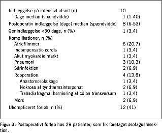 Resultater: I alt ti patienter var indlagt på intensivt afsnit i mediant et døgn (spændvidde 1-40 dage), og den samlede indlæggelsestid var mediant otte dage (spændvidde 6-53 dage). En patient blev genindlagt i et døgn inden for 30 dage. Hos 12 patienter (41%) var forløbet helt komplikationsfrit med en median indlæggelsestid på seks dage (spændvidde 6-14 dage). Ti patienter (34%) fik lettere, medicinske komplikationer og var indlagt i otte dage (spændvidde 7-16 dage), bortset fra en patient, som døde af myokardieinfarkt i fjerde døgn. Syv patienter (24%) fik kirurgiske komplikationer, heraf tre alvorlige (10%), med nekrose af interponat eller anastomose, og en af disse døde i det 21. døgn.