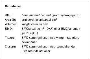 Knoglemineralindholdet opgives almindeligvis som knoglemineraltæthed (BMD) (tekstboks 1). Ved vertebrale frakturer med reduceret korpushøjde bliver BMD forhøjet, uden at dette er udtryk for øget calciumindhold. Bone mineral content (BMC) er i dette tilfælde et sikrere mål, men frakturerede hvirvler bør identificeres på skanningsbilledet eller ved eventuelle røntgenundersøgelser og udelukkes af vurderingen.