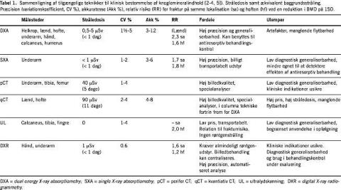 Osteoporose defineres i dag som lav knoglemasse og påvirket knoglearkitektur, som fører til reduceret knoglestyrke og øget risiko for brud. En grænse for bone mineral density (BMD) på 2,5 SD under middelværdien hos raske yngre er af en arbejdsgruppe under WHO foreslået som definition [1]. Vurderingen er baseret på måling af lænd, hofte og underarm. Tærsklen blev valgt, fordi den giver en prævalens, der svarer til livstidsrisikoen for osteoporotiske brud. I de kommende år vil en definition baseret på den estimerede tiårsrisiko for hoftebrud, hvor også andre parametre medregnes, eller på knoglestyrke sandsynligvis vinde indpas. BMD og alder er de stærkeste risikofaktorer for lavenergibrud. Med den tiltagende forekomst af osteoporose og adgang til effektiv behandling er der et stigende behov for måling af BMD. Målingen har tre formål: 1) diagnostik, 2) estimering af frakturrisiko og 3) bestemmelse af knogletab eller behandlingsrespons. For indikationer henvises der til klaringsrapporten fra Dansk Knoglemedicinsk Selskab (DKMS) [2]. Osteodensitometri (OD) er ikke synonymt med dual energy X-ray absorptiometry (DXA), da DXA-skanning kan anvendes til andet end mineralbestemmelse, og måling af BMD kan foregå med andre teknikker. Den bedre adgang til OD muliggør en målrettet indsats over for osteoporose ikke mindst hos patienter med øget risiko på grund af medicinske sygdomme og behandlinger. Et stigende antal læger bliver bedt om rådgivning med baggrund i OD. Desuden pågår der en løbende debat om, hvilke metoder det er bedst at benytte i den daglige klinik. I det følgende gives der en opsummering af de tilgængelige metoder, deres fejlkilder, fortolkning og brug.