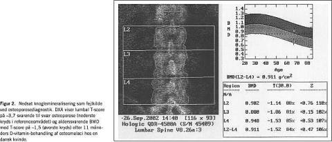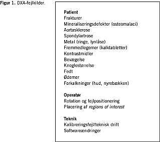 Hvor τ er attenuationskoefficienterne, m den målte attenuation og R en vævsspecifik konstant, som udtrykker forholdet mellem bløddelsattenuation ved de to energiniveauer. Uens fordelt fedt eller ødem omkring den målte knogle er fejlkilder. Akuratessefejlen (Tabel 1 ) ved DXA er størst for lateraloptagelse af columna, 10%, mens den er omkring 5% for standardoptagelserne af hofte og lænd og 2% for underarmen [4]. Sammenhængen mellem volumen og projiceret areal er ikke lineær, hvorfor BMD måles falsk højere i store knogler. Dette giver anledning til en - ganske vist utilsigtet - forbedring af frakturprædiktionen, idet store knogler har større brudstyrke end små ved samme sande densitet. Det mest udbredte DXA-udstyr er af mærkerne Hologic, Lunar og Norland. Resultaterne er ikke direkte numerisk sammenlignelige fra det ene fabrikat til det andet, ligesom normalområderne ikke er kongruente. Med alle nyere DXA-skannere kan man rapportere en i store træk sammenlignelig standardiseret BMD (sBMD). Med det nyeste udstyr kan man undersøge en anatomisk region på et halvt minut eller derunder, og billederne nærmer sig røntgenkvalitet. Hverken fraktur eller metastaser kan dog diagnosticeres tilfredsstillende ved almindelig DXA, hvorfor undersøgelsen i disse tilfælde må suppleres med konventionel røntgen, scintigrafi eller MR-skanning. DXA anvendes typisk på lænd og hofte samt eventuelt som helkropsundersøgelse. De væsentligste fejlkilder til DXA er nævnt i Figur 1 . En vigtig patientafhængig fejlkilde er nedsat knoglemineralisering (Figur 2 ).