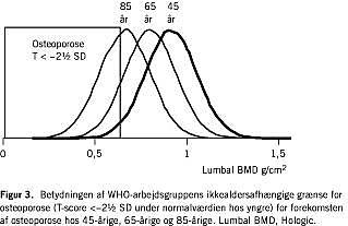 Tabet af knoglemineral efter overgangsalderen sker med forskellig hastighed på forskellige anatomiske steder, og mange patienter har derfor lav BMD på et målested, men normal eller høj BMD i et andet. Tilføjes nye målesteder, stiger hyppigheden af osteoporose [1, 7]. Normalisering af T- og Z-scorer på tværs af anatomiske regioner kan kun skabe kortvarig konkordans [13]. Det har været foreslået udelukkende at basere diagnosen osteoporose på lav BMD i hoften. Dette ville imidlertid betyde, at patienter med svær BMD-nedsættelse i ryggen og stor vertebral frakturrisiko ikke ville blive opfattet som kandidater til medicinsk behandling, selv om der er god evidens for behandlingseffekt i denne patientkategori. Med fejlkilder og frakturepidemiologi in mente er det rationelt at lægge hovedvægten på BMD i columna hos yngre uden degenerative forandringer, mens man hos ældre i højere grad vejledes af forholdene i hoften. Det ses af formlen, at ikke kun middelværdien hos yngre voksne, men også spredningen påvirker forekomsten af osteoporose. Anvendes normalområder med høj middelværdi eller for snæver spredning, vil osteoporose blive overdiagnosticeret. DXA-udstyr leveres med indbyggede normalmaterialer, som imidlertid varierer med hensyn til geografi, rekruttering, eksklusionskriterier og omfang af studiepopulationen. Der findes endnu ikke et dansk normalmateriale for DXA, som dækker alle aldre og begge køn, men DKMS arbejder på et etablere et sådant. Normalområder for børn og mænd er i skrivende stund særligt begrænsede. For hoften findes dog et stort, repræsentativt amerikansk normalmateriale [14].