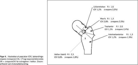 Man skal kunne detektere en behandlingseffekt (responsivitet), og den målte værdi skal være reproducerbar (præcision). En mindre præcis metode kan være brugbar, hvis de forventede ændringer på målestedet er store. Responsivity index (RI) udtrykker den forventede ændring i forhold til CV. I hoften er ændringen i BMD i trochanter under bisfosfonatbehandling således større end i totaloptagelsen af hoften, men præcisionen er ringere. Totalregionen er derfor mere følsom (Figur 4 ). Er ændringen beskeden, kræves der et mere følsomt målested, en mere præcis metode eller længere observation. Få medicinske behandlinger giver anledning til så store stigninger i BMD, at genundersøgelse inden 11/2 -2 år er relevant. Under glukokortikoidbehandling kan tabet i BMD være så stort, at undersøgelse med kortere intervaller er hensigtsmæssigt. Den mindste detekterbare ændring i BMD er 2 √ 2 × CV, hvilket for DXA svarer til ca. 4,2% i lænd og hofte. Det er et åbent spørgsmål, om man for at fortsætte behandling skal kræve 95% sandsynlighed for, at BMD er steget. Nogle forfattere anbefaler et 80% konfidensniveau for ikke at indstille en behandling, som med stor sandsynlighed har været effektiv. Ændring i BMD af lænd og hofte er den sikreste indikator for effekten af antiresorptiv behandling [8, 9]. Nogle medicinske behandlinger reducerer dog frakturforekomsten ti dligere og i højere grad, end hvad man skulle forvente ud fra ændringen i BMD [17]. Der kan være indikation for at genundersøge ubehandlede personer med grænsenedsat BMD efter nogle år. Kvinder omkring menopausen med en T-score på mellem -1/2 og 0 bør genundersøges efter tre år, mens kvinder med en T-score på mellem -1/2 og -1 bør genundersøges efter 1-2 år [18]. Hos 50% af ubehandlede perimenopausale kvinder, som taber signifikant i lumbal BMD, er der intet signifikant knogletab i underarmen [9]. Ved gentagelse af DXA skal man være opmærksom på, om billederne er anatomisk identiske (nummering af vertebrae og hofterotation), og om der er tilkommet sammenfald.