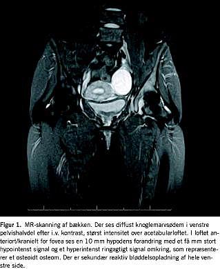 En ultralydsskanning af hoften påviste udtalt synovit, hvilket medførte en reumatologisk udredning. Denne var uden tegn på en reumatologisk lidelse. Der blev herefter foretaget en MR-skanning, som viste voldsomme ødemforandringer i hele den venstre side af bækkenet med opladning efter i.v. kontrast med største intensitet omkring acetabularloftet (Figur 1 ).