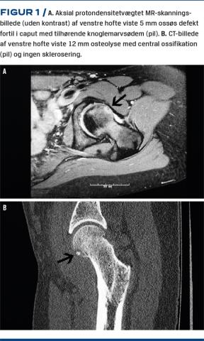 Hun havde bemærket nedsat kraft i venstre ben, men havde ingen natlige smerter. Under den objektive undersøgelse konstaterede man ømhed anterolateralt på låret og en minimal ømhed i lysken. Der var nedsat indadrotation i hoften, men ellers en normal bevægelighed. Der var svagt positivt resultat af en fleksion, adduktion og indadrotationstest og negativt resultat af en fleksion, abduktion og udadrotationstest. Røntgenoptagelser af bækkenet viste normale forhold, ud over en let øget center-edge (CE)-vinkel på 39 grader. Patienten blev henvist til en MR-skanning af venstre hofte (Figur 1 A) og columna lumbalis. MR-skanningen af columna lumbalis viste normale forhold.