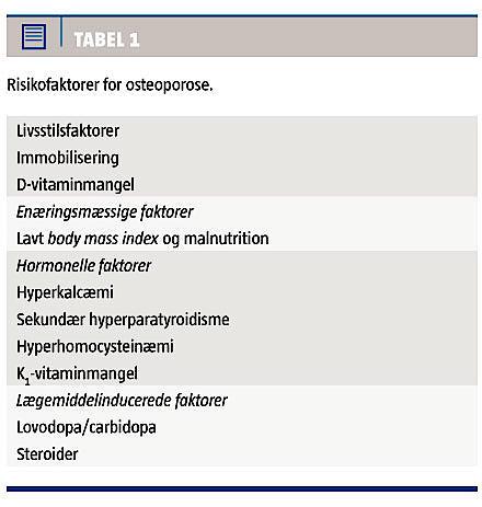 Forekomsten af osteoporose/osteopeni er høj hos PP og synes tillige at være relateret til sværhedsgraden af sygdommen [27], utilstrækkelig soleksponering, lav calciumindtagelse, D-vitaminmangel, immobilisering og lavt BMI [9, 27-29]. Disse faktorer betragtes som risikofaktorer for lav BMD og osteoporose hos PP. Fald og lavt BMD er de vigtigste risikofaktorer for osteoporotisk fraktur hos PP [9]. PP, som er ≥ 65 år og har serumkoncentration af 25-OHD-vitamin < 50 nmol/l, har højere risiko for at få en osteoporotisk hoftefraktur. PP bør, i lighed med den øvrige befolkning, og med den foreliggende evidens, tilbydes BMD-bestemmelse ved DEXA-skanning omkring