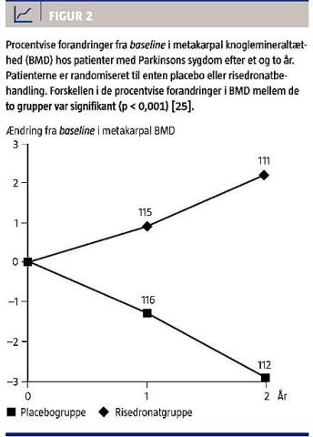 systemet. PS er resultatet af tabet af størstedelen af dopaminneuronerne i substantia nigra, der er beliggende i midthjernen [1, 2]. Der er hos patienter med PS en øget risiko for fald og sekundært hertil en høj forekomst af frakturer [3-6]. Prospektive studier viser, at tilstedeværelsen af PS indebærer en fordobling af risikoen for hoftefraktur [4]. Denne risikoforøgelse ligger ud over den risiko for fraktur, der er betinget alene af stigende alder og samtidigt aldersrelateret knoglemineraltæthed (BMD)-tab. Resultater fra andre prospektive studier indikerer, at sammenhængen mellem PS og lav BMD kan øge risikoen for fraktur hos patienter med PS uafhængigt af den forøgede risiko, der er forbundet med øget faldtendens [7, 8]. Der har dog kun været publiceret få studier om osteoporose hos patienter med PS.