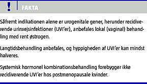 I fire studier viste man samstemmende, at systemisk (oral) østrogen ikke reducerede forekomsten af UVI'er i behandlingsperioden sammenlignet med placebo [3, 11-13]. De poolede data fra de fire studier repræsenterer 2.798 patienter, og den vægtede metaanalyse er ganske overbevisende med en RR på 1,08 og 95%-KI på 0,88-1,33. Den væsentligste del af data hidrører fra et studie, som bidrager med imponerende 2.654 patienter og mere end fire års behandling og opfølgning [3]. Dette amerikanske multicenterstudie var dog primært designet til at undersøge den kardiovaskulære effekt af hormontilskud i en population af postmenopausale kvinder med etableret koronarsygdom. Desuden modtog patienterne i aktiv behandling en kombinationsbehandling med 0,625 mg konjugeret ekvint østrogen plus 2,5 mg hydroxyprogesteron, som ikke anvendes i Danmark, hvorfor resultaterne ikke kan overføres på danske forhold.