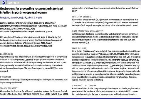 Cochrane-reviewet inkluderede ni studier, hvor postmenopausale kvinder med RUVI blev randomiseret til enten østrogen (enten systemisk eller lokalt i vagina) eller placebo eller anden aktiv behandling.