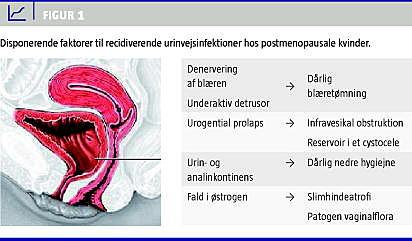 Recidiverende urinvejsinfektioner (RUVI) hos kvinder er en velkendt klinisk problemstilling, specielt i almen praksis. To risikopopulationer udskiller sig: unge, seksuelt aktive kvinder henholdsvis ældre kvinder, oftest flere år efter menopausen. Patofysiologien - og dermed forebyggelses- og behandlingsstrategien - er ret forskellig i de to grupper. Hos postmenopausale kvinder spiller flere faktorer ind (se Figur 1 ): En aldersbetinget svækkelse af blærens innervation og/eller detrusormusklens kontraktilitet kan reducere blærens tømmefunktion. Urogential prolaps kan medføre infravesikal obstruktion eller et utømmeligt reservoir i et cystocele. Inkontinens for urin og fæces med påvirkning af den nedre hygiejne samt hormonelt betingede ændringer i urogenitalslimhinder og vaginalflora vil også øge risikoen for RUVI. Endelig kan konkurrerende lidelser som immobilitet, diabetes, sequelae efter neurologiske lidelser eller kirurgi i det lille bækken mv. være medvirkende årsager til RUVI.