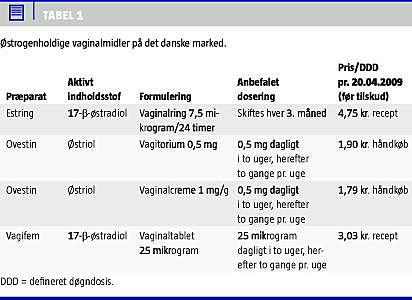 Studiet med østriolcreme viste bedre effekt end studiet med østradiolring, men dette kan skyldes forskelle i studiepopulationerne eller andre forhold. Idéelt set burde præparaterne undersøges i head-to-head -studier. Med den foreliggende evidens er det derfor ikke muligt at anbefale den ene behandling frem for den anden, og i den daglige kliniske praksis kan man derfor lade sig vejlede af andre forhold som administrationsmåder, gener, pris mv. samt øvrige indikationer (Tabel 1 ). Østriolcremen synes at afhjælpe seksualgener lidt bedre end de øvrige administrationsmåder [14], formentlig grundet tilførslen af creme snarere end forskellig aktivitet mellem de aktive stoffer. Estradiolringen synes at være lidt bedre accepteret af patienterne, formentlig på grund af den lette administration med ringskift hver tredje måned [15]. Der synes ikke at være væsentlige forskelle mellem præparaterne, når det gælder objektive parametre som vaginalcytologi, pH etc. [15]. Langtidsbehandling med lokal østrogenbehandling giver ikke anledning til væsentlige bekymringer vedrørende systemiske bivirkninger og fordrer ikke samtidig gestagenbehandling, selv om patienten har uterus intakt [16].