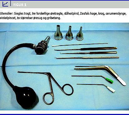 Yderligere utensilier er øretragte af forskellig diameter og udstyr til instrumentering, herunder vinklet pincettang, øresug i forskellige kalibre, stålvatpind, cerumenslynge, vinklet krog og Zaufals hage. Terapeutisk kan der blive brug for en paracentesenål. Et supplerende diagnostisk instrument i undersøgelsen af TH er Siegles tragt, som med fordel bruges under OTM (Figur 1 ).