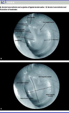 TH opdeles i kvadranter, som bruges til beskrivelse af fund (Figur 4B). Endvidere kan TH opdeles i pars flaccida og pars tensa (Figur 4A).