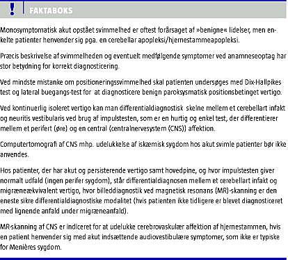 Monosymptomatisk, akut opstået svimmelhed er oftest forårsaget af »benigne« indre øre-lidelser, men kan i sjældne tilfælde være tegn på cerebellar apopleksi/hjernestammeapopleksi.