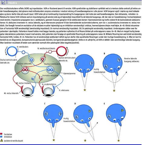 Den vigtigste test er impulstesten [20]. Den bygger på den vestibulookulære refleks (VOR), som med ti millisekunders respons orienterer øjnene, således at man har et skarpt billede af omgivelserne under hurtig hovedbevægelse i alle planer. Med impulstesten kan man med stor sensitivitet og specificitet skelne mellem vestibulære (perifere) og cerebellare (centrale) årsager til akut vertigo og spontan nystagmus [12]. VOR og impulstesten er vist i Figur 1 . Testens udfald er kommenteret i afsnittet om cerebellart infarkt og hjernestammepatologi nedenfor. Den er meget enkel og bør udføres ved undersøgelse af alle svimle patienter. Impulstesten kan objektiviseres elektrofysiologisk ved video head impulse test , således at VOR kan objektiviseres for alle buegange.