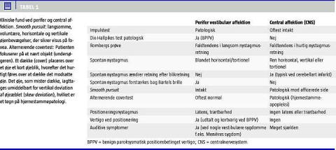 Et cerebellart infarkt kan ligne et perifert indre øre-fokus (neuritis vestibularis), idet et infarkt ikke nødvendigvis er associeret med typiske tegn, såsom ataksi, dysartri, postural instabilitet, hovedpine eller patologiske øjenbevægelser [12, 29]. Vertigo og balancebesvær kan således være de eneste gener [30-33]. Typisk opstår symptomerne dog meget akut og ikke over timer som ved neuritis vestibularis [34]. Det vigtigste kliniske tegn er en normal impulstest, der praktisk talt altid er patologisk ved neuritis vestibularis [12, 13, 35]. Derfor har patienter med en anamnese, der tyder på neuritis vestibularis, og et normalt udfald af impulstest et cerebellart infarkt, indtil andet er påvist. H ermed har impulstesten en meget vigtig plads i den akutte differentialdiagnostik.