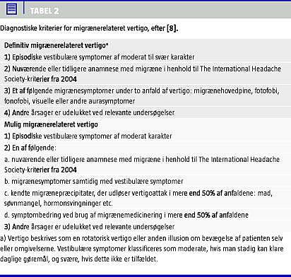 Tilstanden, som ikke anerkendes af The International Headache Society, er en hyppig diagnose på otoneurologiske klinikker. Diagnosen stilles per exclusio og er beskrevet af Neuhauser et al (Tabel 2 ). Størsteparten af patienterne har hovedpine samtidig med et rotatorisk eller nautisk svimmelhedsanfald. De fleste har imidlertid haft monosymptomatisk migrænehovedpine i måneder til år inden debut af relateret vertigo [39]. Ikke sjældent har patienten bemærket en øget frekvens af hovedpineanfaldene og samtidig oplevet vertigo, men uden at disse forekom samtidig. Hyppigt ses der forværring ved bestemte, individuelt betingede hovedpositioner [37]. Svimmelhedsanfaldene varierer i længde, således at flertallet har symptomer i minutter til timer, mens enkelte har symptomer i timer til dage. Behandlingen er en specialopgave.