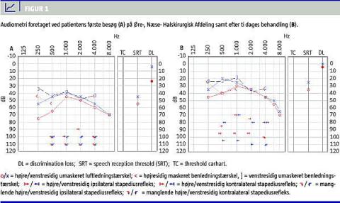 Efter ti dages behandling blev patienten på ny set på Øre-Næse-Halskirurgisk Afdeling, hvor fornyet audiometri (se Figur 1) viste klar bedring i hørenedsættelsen (PTA0,5-4 kHz = 38/31), mens tinnitus var i aftagende.