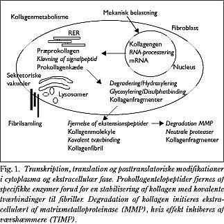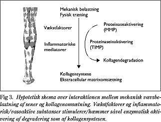 Regulering af kollagenomsætning i senevæv er kun sparsomt forstået, men det er foreslået, at den er intimt koblet til degradationsprocesser, understøttet af fund på type 4-kollagenomsætning i muskulatur (23). I dyremuskulatur er det vist, at hårdt excentrisk arbejde (»bremsearbejde«) forøger både transkription og proteindannelse af metalloproteaser, og at dette er ledsaget af en forøgelse i transkription af type IV kollagen (25). Endvidere har man fundet, at totalmængden af kollagen var uforandret, ligesom processen var ledsaget af en aktivering af inhiberende faktorer for metalloproteaser (TIMP). Metalloproteaser kunne således via aktivering af kollagendegradering stimulere til øget kol-lagendannelse, og denne effekt kunne delvist reguleres og limiteres af TIMP (Fig. 3 ).