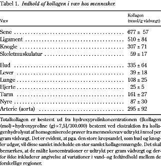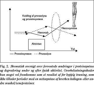 Kollagendannelse i muskelvæv forøges hos dyr i forbindelse med træning, mens immobilisering sænker kollagensyntesen (3). Akut mekanisk belastning medfører en nedsat kollagen type 1-dannelse efterfulgt af en markant stigning i dagene efter fysisk aktivitet (8). Initialt nedsat proteindannelse under mekanisk belastning og en efterfølgende forøgelse i restitutionsfasen efter arbejde er analogt med fund inden for muskelproteinsyntese ved fysisk aktivitet (15) (Fig. 2 ). Endvidere har træningsstudier vist, at kollagen type 1-syntesen i senevæv kronisk eleveres ved ugers fysisk træning, hvorimod degradation af kollagen type 1 forøges mest udtalt i de første træningsuger (16). Disse fund indikerer, at træning medfører en forøgelse af kollagenomsætning, mens en markant nettosyntese først fremkommer efter talrige ugers/måneders indsats og kan forklare, hvorfor senevæv kræver betydelig tid for at adaptere optimalt til mekanisk belastning på trods af en ganske høj vævsomsætning af kollagen (17) (Tabel 1 ).
