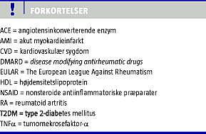 Forskningsmæssigt har interessen for CVD ved RA været stor i de forløbne år, og det har bl.a. vakt betydelig opmærksomhed, at resultaterne fra nye studier har vist samme risiko for CVD hos patienter med RA og type 2-diabetes mellitus (T2DM) [3, 4]. På baggrund af den voksende evidens inden for området har det europæiske reumatologiske selskab (The European League Against Rheumatism (EULAR)) netop udsendt anbefalinger for håndtering af risiko for CVD hos patienter med RA [5]. Det er derfor fundet relevant at give en kort status over nye resultater vedrørende epidemiologiske og kliniske aspekter af associationen mellem RA og CVD, samt vedrørende effekten af den farmakologiske RA-behandling på risikoen for CVD (og omvendt). Til slut præsenteres og kommenteres EULAR's nye retningslinjer.
