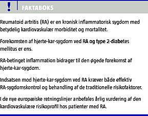 RA er ikke alene en kronisk inflammatorisk ledsygdom, men også en selvstændig risikofaktor for CVD. Risikoen for CVD er omtrent fordoblet hos RA-patienter og er på linje med risikoen ved T2DM. Ved RA er symptomerne på CVD ofte atypiske, og der er bl.a. øget opmærksomhed på forekomsten af hjertesvigt og formodet underbehandling med kardiovaskulær farmakoterapi. Ved RA kan DMARD og anti-TNF?-behandling formentlig reducere risikoen for CVD, men definitive undersøgelser afventes. EULAR's ti anbefalinger vedrørende risikoen for CVD ved RA understreger vigtigheden af reduktion af traditionelle CVD-risikofaktorer, sufficient RA-behandling samt årlig vurdering af den kardiovaskulære risikoprofil, hvilket bør integreres i den kliniske kontrol af disse patienter.