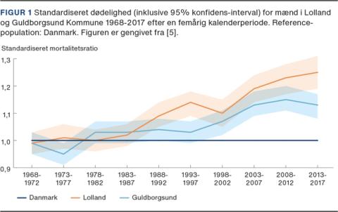 I perioden 1968-1987 var dødeligheden i Lolland Kommune helt svarende til dødeligheden i Danmark med en SMR på 1-5% (Figur 1). Men fra 1988 begyndte dødeligheden i Lolland Kommune at falde langsommere end dødeligheden i Danmark som helhed. I 2013-2017 var overdødeligheden på 25% for mænd og 20% for kvinder. I Guldborgsund Kommune var dødeligheden for mænd helt op til 1997 på niveau med dødeligheden for mænd i Danmark, og for kvinder var dette tilfældet op til 2002. Men i 2013-2017 var der en overdødelighed i Guldborgsund Kommune for mænd på 15% og for kvinder på 11%. Overdødeligheden forekom blandt personer i den erhvervsdygtige alder. For personer på 70 år og derover var der ingen forskel mellem dødeligheden for indbyggere på Lolland-Falster og indbyggere i Danmark som helhed.