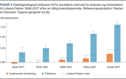 Analysen bygger på alle 9.400.000 personer, der har boet i Danmark siden starten af CPR i 1968, hvilket gav 260.000.000 personår og 2.800.000 dødsfald. I 1968-1977 svarede dødeligheden i den fastboende befolkning på Lolland-Falster til dødeligheden i resten af Danmark med en MRR på 2%, mens den fastboende befolkning i 2008-2017 havde en overdødelighed på 14% (Figur 2). I 1968-1977 var overdødeligheden blandt tilflyttere på 17%, og i 2008-2017 var den steget til 82%. Figuren viser, at i hver tiårsperiode svarede overdødeligheden hos den fastboende befolkning til gennemsnittet af overdødeligheden for fastboende og tilflyttede i den foregående tiårsperiode. Dette mønster indikerer, at den gradvise stigning i overdødeligheden blandt fastboende på Lolland-Falster sammenlignet med dødeligheden i Danmark i øvrigt stammede fra en stadig tilflytning af borgere med en væsentlig overdødelighed i forhold til Danmark i øvrigt. Tilflyttere havde en overdødelighed i alle alder, men det var mest udtalt for tilflyttere i alderen 30-64 år. I 2008-2017 var overdødeligheden på 134% hos tilflyttere i den erhvervsdygtige alder.