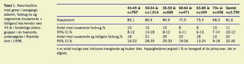 Hyppigheden af brug af naturmedicin for gener i overgangsalder opdelt efter aldersgrupper (Tabel 1) er højest i den aldersgruppe, der omfatter menopausealderen, for derefter at falde. Det svarer til, at indikationen for de registrerede naturlægemidler er hedeture. Der ses ikke stigende andele ved stigende alder, som ved brug af hormontilskud, hvor forbruget topper i aldersgrupperne 55-64 år i vores undersøgelse. 5% af 55-56-årige svenske kvinder brugte »alternative remedies«, mens ca. fire gange så mange havde prøvet det mod gener i overgangsalderen [2]. I en anden svensk spørgeskemaundersøgelse blandt 5.990 kvinder i Göteborg i 1992 svarede 45%, at de havde brugt »non-hormonal treatment regimens«, lige fra Melbrosia til magnetiske armbånd [3]. Gass et al [4] refererer, at i 1997 i USA brugte 12,1% af befolkningen »herbal medicine«, af dem var der flest kvinder (der er ikke angivet grunde til det). På en menopauseklinik i London i 1999 havde 69% af 200 konsekutivt udvalgte kvinder nogensinde prøvet »complementary therapies« for gener i overgangsalderen [5]. I det danske sygeplejerskestudie [6] var 44% af de < 60-årige og 46% af de > 60-årige nogensinde brugere af »herbal medicine«. Der er flere undersøgelser, der viser, at læger er mere tilbøjelige til at bruge hormontilskud end resten af befolkningen [7-9]. Det vides ikke, om danske læger også bruger mere naturmedicin end befolkningen, ligesom sygeplejersker gør i Hundrups studie. I Isaacs et als undersøgelse af kvindelige læger i UK [8] findes, at de, der brugte »non-hormonal preparations for the menopause«, oftere brugte hormontilskud end de, der ikke brugte »non-hormonal preparations for the menopause« (odds-ratio 2,04 signifikant på 5%-niveau).