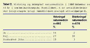 96% af de kvinder, der havde brugt naturmedicin, svarede på, om der var virkning af naturmedicinen, og 92% svarede på, om der var bivirkning (Tabel 2 ).