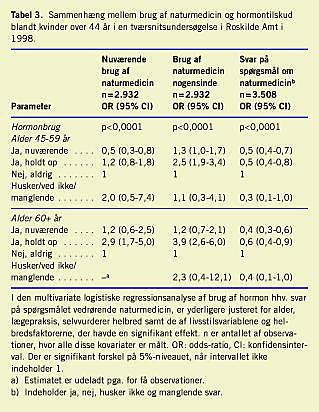 I Tabel 3 ses, at hormonbrugere svarede på spørgsmålet vedrørende naturmedicin i mindre grad, end kvinder, der aldrig havde taget hormon. Blandt dem der svarede, sås en tendens til, at kvinder, der havde taget hormontilskud, oftere også havde prøvet naturmedicin, end kvinder, der ikke havde taget hormontilskud.