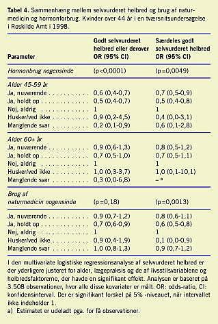 95% CI 1,9-3,4 for 45-59-årige og OR 3,9 95% CI 2,6-6,0 for ≥ 60-årige), sammenlignet med kvinder, der aldrig havde taget hormontilskud. Nogle kvinder anvendte både naturmedicin og hormontilskud. Dog var der færre kvinder blandt de 45-59-årige nuværende brugere af hormontilskud, der anvendte naturmedicin (OR 0,5 95% CI 0,3-0,8) sammenlignet med kvinder, der aldrig havde anvendt hormontilskud. Færre kvinder, der tidligere havde taget naturmedicin, havde godt selvvurderet helbred eller derover henholdsvis særdeles godt selvvurderet helbred (OR 0,7 95% CI 0,6-0,9 henholdsvis OR 0,6 95% CI 0,5-0,8) i forhold til de, der aldrig havde taget naturmedicin.
