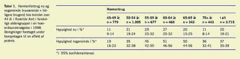 Materiale og metoder: Et anonymt spørgeskema blev postomdelt til 5.300 kvinder over 44 år udvalgt tilfældigt blandt tilmeldte lægers patienter af sygesikringen i Roskilde Amt i 1998. 72% svarede. Data blev statistisk analyseret med multivariat logistisk regressionsanalyse under hensyntagen til, at de var indsamlet via praktiserende læger.
