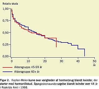 Det første år falder varigheden af hormontilskud stejlt og nogenlunde ens i de to aldersgrupper, mere end halvdelen af dem, der begyndte at tage hormontilskud, tog hormontilskud i mere end ti år.