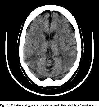 I det fjerde døgn ændredes patienten cerebralt, og der opstod krampeanfald, som blev behandlet med diazepam og valproat. En computertomografi (CT) af cerebrum viste bilaterale symmetriske iskæmiske områder på overgangen mellem a. cerebri media og a. cerebri posteriors forsyningsgebet, hvilket blev fortolket som hypoksisk encefalopati (Figur 1). En elektroencefalografi (EEG) viste svært abnorme forhold. En transkranial Doppler-sonografi var uden tegn på abnormt flowmønster og gav ikke mistanke om rebound vasospasmer eller cirkulationsstop i de større intracerebrale kar.