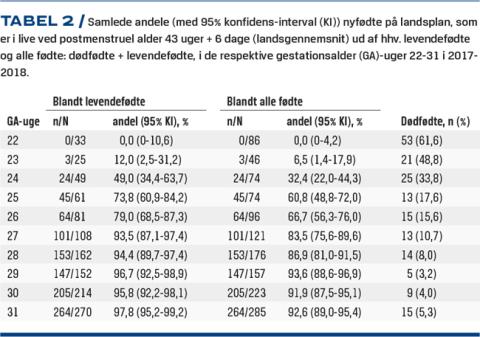 Overlevelse blandt ekstremt for tidligt fødte er lavere end for mature børn, men er stigende (Tabel 2 og Tabel 3). I de svenske nationale opgørelser fandt man en etårsoverlevelse blandt levendefødte, der var født i uge 22-26 i perioden 2014-2016 på 77% mod 70% i perioden 2004-2007 [6, 8]. Tal fra Norge fra perioden 2013-2014 viser en lidt lavere overlevelse, men stadig blandt de højest rapporterede globalt [7]. Fra GA uge 27/28 stiger overlevelsen af levendefødte til over 90% i det meste af Europa, og for alle børn, som er født efter uge 29, er den > 95% [24]. Selvom overlevelsen for meget og moderat for tidligt fødte børn stadig er lavere end for børn, der er født til terminen, er dette i højere grad betinget af øget forekomst af andre perinatale risikofaktorer end egentlig fysiologisk umodenhed.