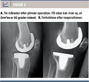 Efter et år, hvor patienten havde fået en ny totalhoftealloplastik og været til yderligere kontroller, bad hun om at få en second opinion. Hun havde stadig smerter og nedsat funktion i venstre knæ. På sygehus D blev der taget nye røntgenbilleder, som viste en 90-graders-rotation af polyætylen-liner’en. Dette gav en forklaring på det langsomme genoptræningsforløb, den indskrænkede bevægelighed og smerterne. Ved gennemgang af de primære postoperative billeder kunne det konstateres, at liner’en allerede på det tidspunkt var roteret 90 grader (Figur 1).