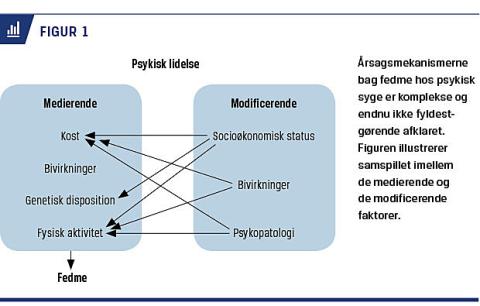 Som for baggrundsbefolkningen er vægtøgning hos psykisk syge et resultat af ubalance mellem energiindtag og energiforbrug. Livsstil er en medierende faktor, der forklarer en del af sammenhængen mellem fedme og psykisk lidelse. Dertil kommer en række modificerende faktorer (Figur 1), der i et komplekst samspil påvirker udviklingen af fedme. Det er uafklaret, hvilke faktorer der har størst betydning for udviklingen af fedme.
