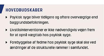 Patienter med psykisk lidelse rammes særlig hårdt af fedmeepidemien. I Den Nationale Sundhedsprofil 2010 rapporteredes det, at næsten dobbelt så mange danskere med en selvrapporteret psykisk lidelse som danskere uden en psykisk lidelse (20,9% vs. 12,9%) var svært overvægtige (BMI > 30 kg/m2). Dette har betydelige konsekvenser for livskvalitet, morbiditet og mortalitet, og prævalensen er endnu højere for personer med svære psykiske lidelser. I internationale studier vurderer man, at risikoen er størst for personer med psykoselidelser, da de har 2,8-4,4 gange højere risiko for overvægt eller fedme end baggrundsbefolkningen. For personer med svær depression eller bipolar lidelse er risikoen 1,2-1,7 gange højere end baggrundsbefolkningens [1-3]. Nationale og internationale populationsundersøgelser har vist stigning i prævalensen af fedme over de seneste 30 år. Tilsvarende undersøgelser findes desværre ikke for subpopulationer med psykisk sygdom.