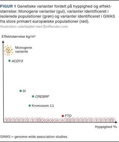 I modsætning til varianterne identificeret hos europæere har man i studier af isolerede populationer fundet varianter med langt større effekt på overvægt. I studier af individer fra Grønland har man identificeret en variant på kromosom 11 med en effektstørrelse på 0,64 kg/m2 pr. effektallel [10] og en variant i SI med en effektstørrelse på 2,0 kg/m2 blandt bærere af to kopier af effektallellen [11]. Begge disse varianter associerer med et lavere BMI og en gunstig metabolisk profil. Omvendt associerer en mindre hyppig variant i ADCY3 med en øget risiko for overvægt med en effektstørrelse på 7,3 kg/m2 blandt bærere af to kopier af effektallellen [12]. Ydermere har studier af individer fra Samoa identificeret en hyppig variant i CREBRF med stærk association til et højt BMI med en effektstørrelse på 1,36 kg/m2 pr. allel [13] (Figur 1). Disse særlige varianter med både større hyppighed og effektstørrelse kan potentielt anvendes klinisk til forebyggelse ved tidligt at identificere individer med høj risiko for at udvikle overvægt, og de kan give en mere specifik information om ætiologien bag overvægten.