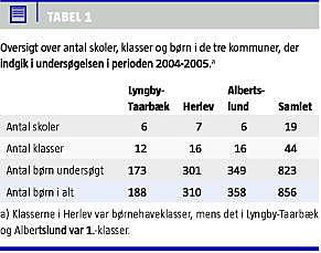 I Herlev blev børnene undersøgt i børnehaveklassen, mens undersøgelsen i Albertslund og Lyngby-Taarbæk Kommuner foregik i 1. klasse. Dataindsamlingen foregik i perioden fra august 2004 til juni 2005. For at opnå en høj deltagelsesprocent blev udeblevne børn indkaldt igen. Fra Lyngby-Taarbæk deltog børn fra otte ud af 17 skoler.