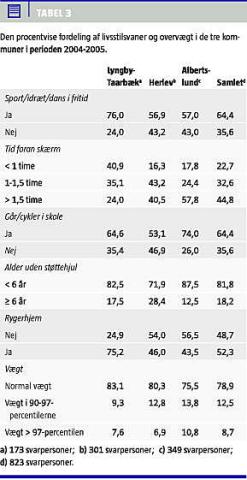 I den samlede population var 21,2% af børnene > 90- percentilen. Heraf var 8,7% > 97-percentilen (overvægtige). Overvægt inklusive begyndende overvægt (> 90-percentilen) blandt børn var hyppigere i familier, hvis faren ikke var tilknyttet arbejdsmarkedet (37% versus 20% hvor far var i arbejde p < 0,001). Der fandtes også en tendens til øget forekomst af overvægt hos børn af mødre, der ikke havde tilknytning til arbejdsmarkedet, men forskellen var ikke signifikant. Andelen af overvægtige børn var lavest i Lyngby-Taarbæk, højest i Albertslund, mens Herlev lå midt imellem. Børnene i Lyngby-Taarbæk Kommune var mere fysisk aktive med hensyn til sportsdeltagelse og skærmtid. (Tabel 3).