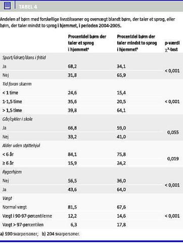 Der var blandt de tosprogede børn en øget forekomst af adfærd, som er forbundet med øget risiko for livsstilssygdomme (Tabel 4 ). De gik mindre hyppigt til sport i fritiden, der var flere, der ikke kunne cykle i en alder af seks år, og flere som sad i længere tid foran skærm i det daglige. Børnene boede oftere i rygerhjem. Der var desuden en tendens til, at færre af børnene cyklede til skole, men forskellen var ikke signifikant (Tabel 4).