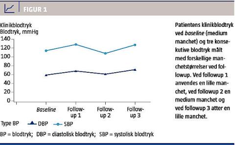 En 11-årig hidtil svært overvægtig, men i øvrigt rask dreng mødte til etårsgenundersøgelse i et projekt med fokus på hjertekredsløbet i Enheden for Overvægtige Børn og Unge. Patienten havde i løbet af et års intervention tabt sig 3,3 kg og var vokset 6,2 cm i højden, hvilket svarer til et fald i BMI på 3,4 kg/m2. Han havde ved fremmødet et BMI på 18,3 kg/m2 (z-score 0,73) og var således ikke længere overvægtig. Klinikblodtrykket blev målt med et oscillometrisk apparat, OMRON 705IT, der er valideret hos børn og unge. Patientens baseline- hhv. followupklinikblodtryk var 114/59 mmHg (z-score: 1,15/–0,18) og 128/68 mmHg (z-score 2,63/0,69). Dermed fandt man systolisk hypertension ved followup og en stigning i blodtrykket på 14 mmHg systolisk og 9 mmHg diastolisk. Patienten var ved baseline og followup blevet undersøgt med hhv. en medium (overarmsomkreds 24,5 cm) og en lille (overarmsomkreds 21,7 cm) blodtryksmanchet, iht. producentens anvisninger. Uden for protokol, men på tilsvarende vis blev der tillige bestemt gennemsnit af tre ekstra klinikblodtryksmålinger med mediummanchet, hvilket viste 108/61 mmHg (z-score 0,82/0,08, dvs. normotension). For at dette ikke skulle kunne tilskrives, at patienten nu havde slappet mere af og derved havde opnået potentiel reduktion af blodtrykket, gentog man tre målinger med den lille manchet og fandt nu et gennemsnitligt blodtryk på 126/71 mmHg (z-score 2,47/0,92, dvs. atter systolisk hypertension). Klinikblodtrykket ses i Figur 1.