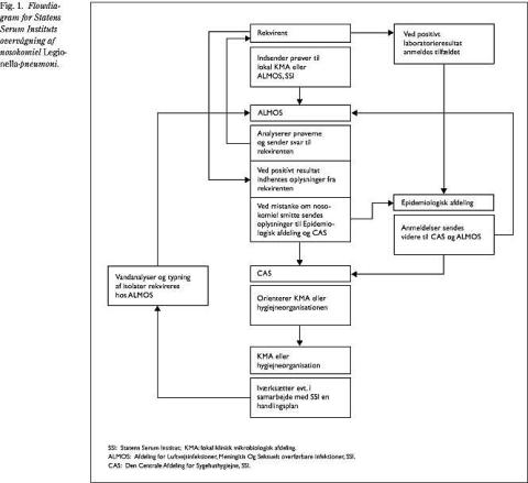 Legionella- pneumoni er individuelt anmeldelsespligtig (1), og den nationale overvågning af nosokomiel Legionella -pneumoni varetages af Den Centrale Afdeling for Sygehushygiejne (CAS) i samarbejde med Epidemiologisk afdeling og Afdeling for Luftvejsinfektioner, Meningitis Og Seksuelt overførbare infektioner (ALMOS) på Statens Serum Institut (SSI). Epidemiologisk afdeling modtager og registrerer anmeldelserne fra de behandlende læger og sender dem videre til CAS og ALMOS.