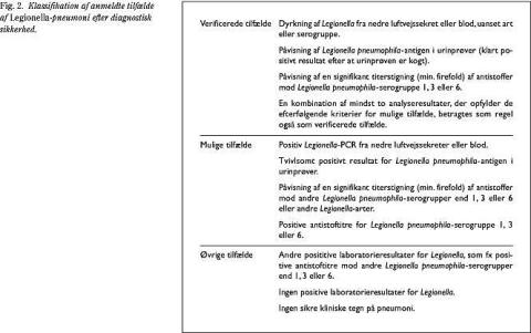 De anmeldte tilfælde af Legionella -pneumoni klassificeres i tre grupper på basis af foreliggende laboratorieanalyser, de klassificeres desuden i tre klasser: verificerede tilfælde, mulige tilfælde og øvrige tilfælde, der normalt ikke registreres (Fig. 2 ). Det skal bemærkes, at alle anmeldelser gennemgås kritisk af en læge, og at klassifikationen i Fig. 2 i nogle tilfælde kan tilsidesættes (fx ved udbrud).