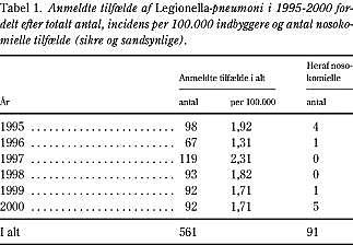 Selv om muligheden for eksposition foreligger i de fleste menneskers dagligdag, er forekomsten af anmeldte tilfælde af Legionella -pneumoni i Danmark lav. I perioden 1995-2000 registrerede man i hele landet gennemsnitligt lidt under 100 tilfælde per år med laveste årlige antal = 67 og højeste årlige antal = 119. I samme periode registrerede man et årligt gennemsnit på 15 nosokomielle tilfælde med laveste årlige antal = 10 og højeste årlige antal = 24 (Tabel 1 ).