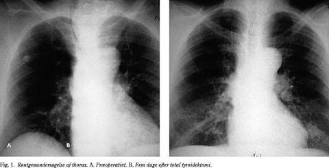 Resultater: Den operative behandling bestod i hemityroidektomi i ti tilfælde og total tyroidektomi i 23 tilfælde. I alle tilfælde kom der objektivt en betydelig bedring i respirationen, og røntgenundersøgelsen viste en normalisering af tracheas lumen. I 24 af 33 tilfælde (73%) havde flowvolumenkurven præoperativt en form, der var forenelig med en variabel øvre luftvejsobstruktion (dvs. MIF 50 <MEF 50). Postoperativt fandtes en stigning i PEF hos 21 patienter (64%) og MEF 50/MIF 50 <1 hos 19 patienter (58%).